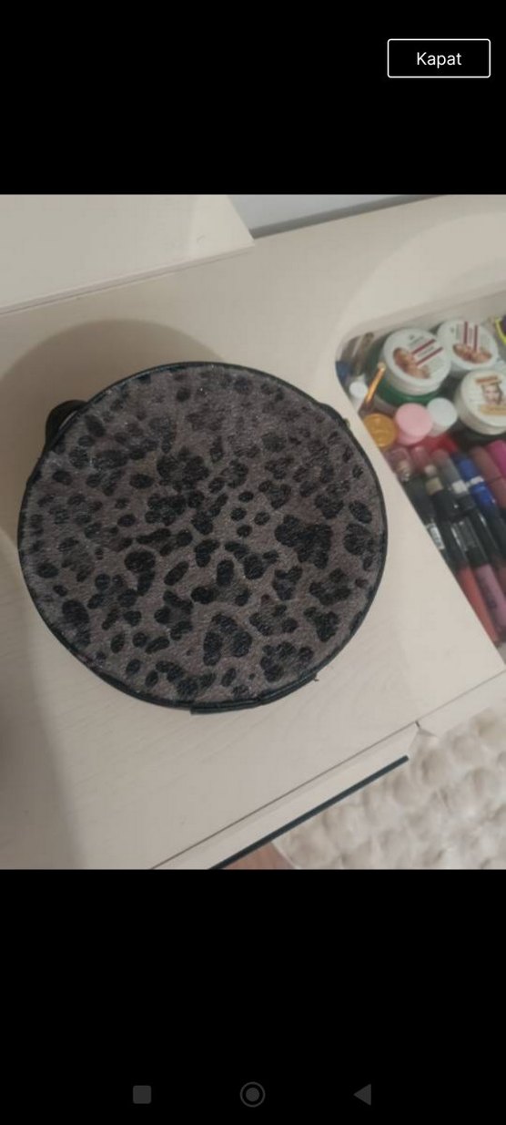Kahverengi süet kadın clutch, gri leopar desenli ve kürk detaylıdır. Sıcak ve rock punk tarzını bohem dokunuşla buluşturur.