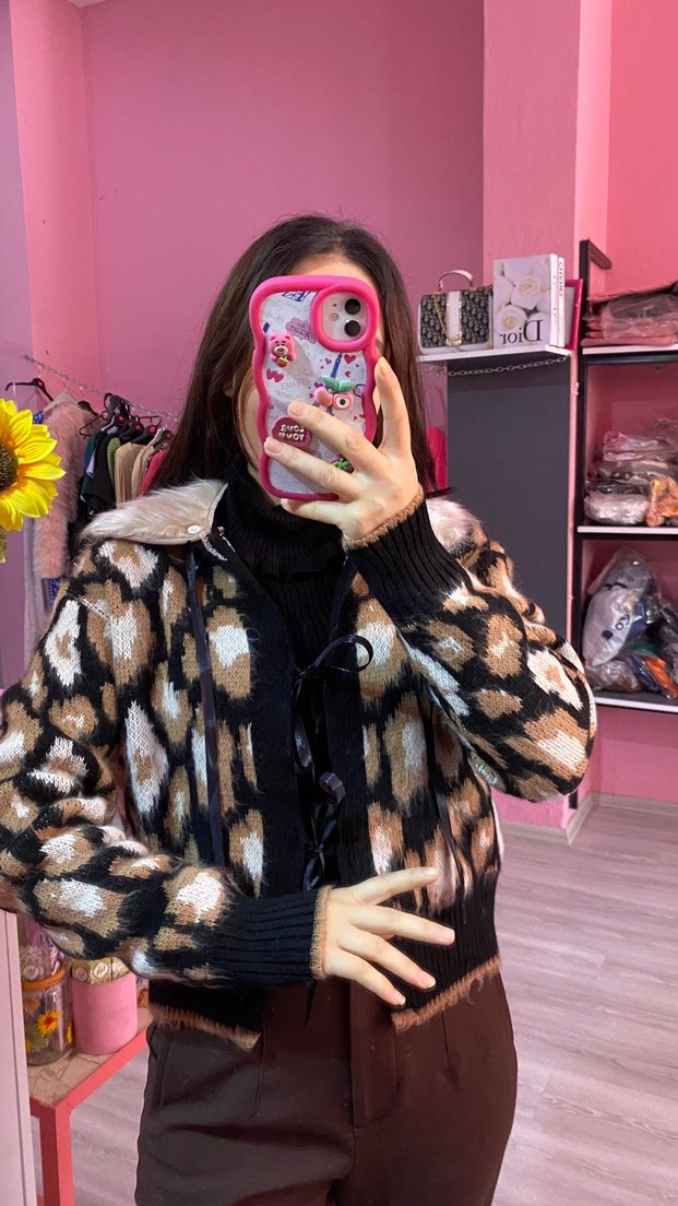 Kürk detaylı, leopar desenli triko ceket. Uzun kollu ve boğazlı, midi boyda, rahat ve şık bir sokak stili parçası.
