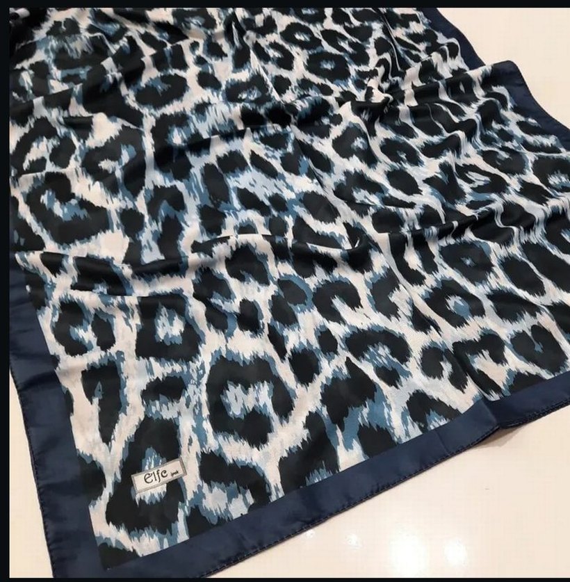 Yumuşak sentetik kumaştan, kürk detaylı koyu mavi kadın fular. Bohem, hippie ve retro tarzlara uygun desenli tasarım.