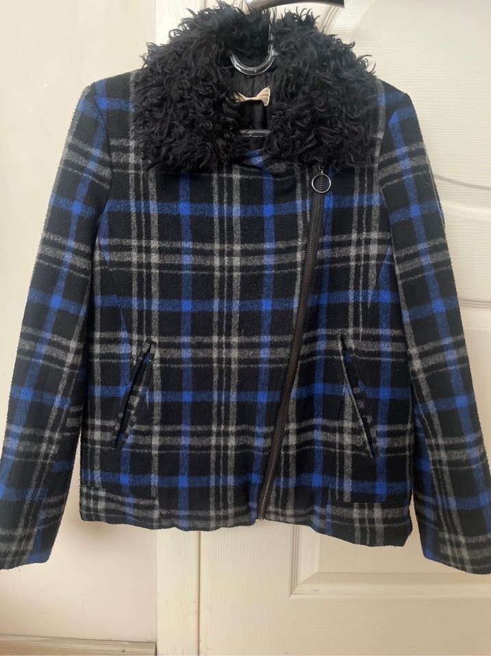 Kürk detaylı, mavi kareli yün kumaştan, uzun kollu ve normal boyda, ofis için uygun, rahat ve şık kadın kabanı.