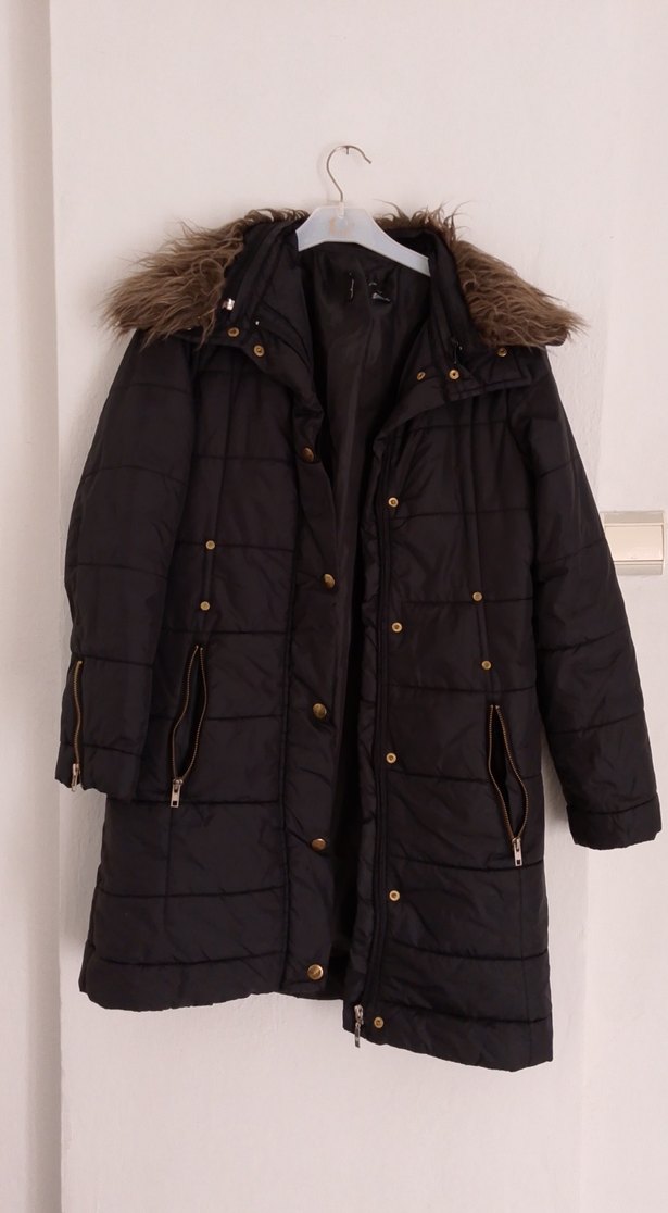 Kürk detaylı kapüşonlu, yumuşak kumaştan yapılmış, fitted kesim siyah midi uzunlukta kadın kışlık mont. Strappy kollu ve notched lapel yaka ile trendy günlük kullanıma uygun.