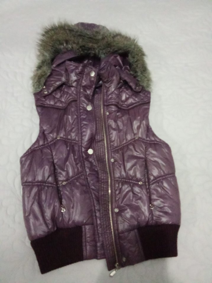 Kürk detaylı, yakalı, mor renkli, sentetik kumaştan yapılmış kolsuz yelek. Fitted kesim ve midi boy, sokak modasına uygun rahat bir parça.