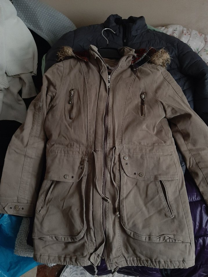 Kürk detaylı, normal boy, uzun kollu kadın kaban. Notch yaka ve cep fermuarları ile rahat ve sıcak tutar. Günlük ve sokak stiline uygun, kahverengi-gri tonlarında midi boy.