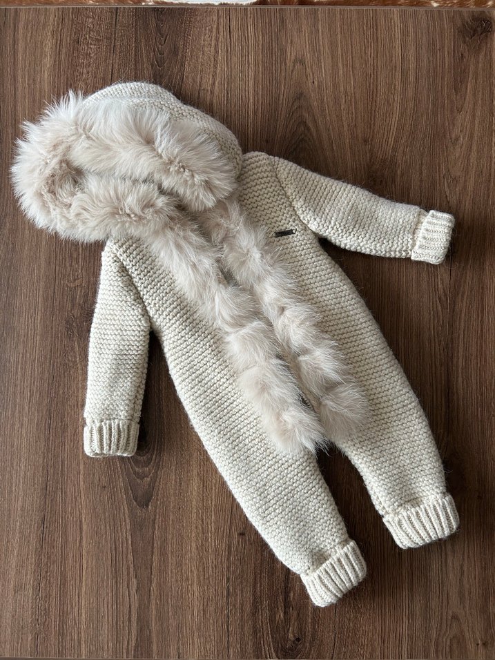 Krem renkte, kürk detaylı kapüşonlu, içi peluş bebeğinizi sıcacık tutacak örme tulum. Kapüşonundaki ve önündeki kürkler çıkarılabiliyor. Çok beğenerek almama rağmen mevsim-ay olarak benim bebeğime uymadı. Etiketini yıkamak amaçlı kesmiştim ancak hiç giyilmedi. 6-9 ay için. Baby Mia marka.
