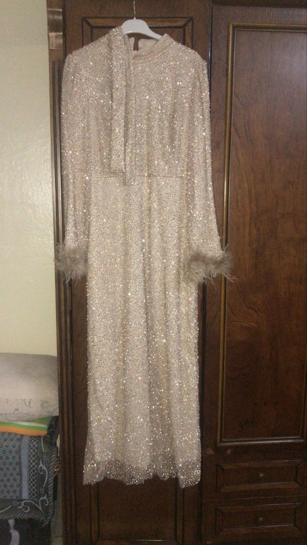 Parlak kumaş ve kürk detaylı, bol kesim uzun bej abiye elbise. Askısız yakalı ve uzun kollu, bohem şıklık sunar. Düğünler için uygundur. ✨