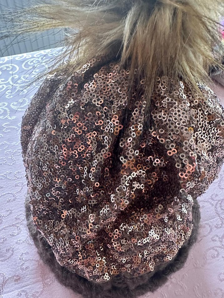 Parlak payetlerle süslenmiş, kürk detaylı kahverengi örme kadın bere. Bohem ve retro tarzda, rahat bir modeldir.
