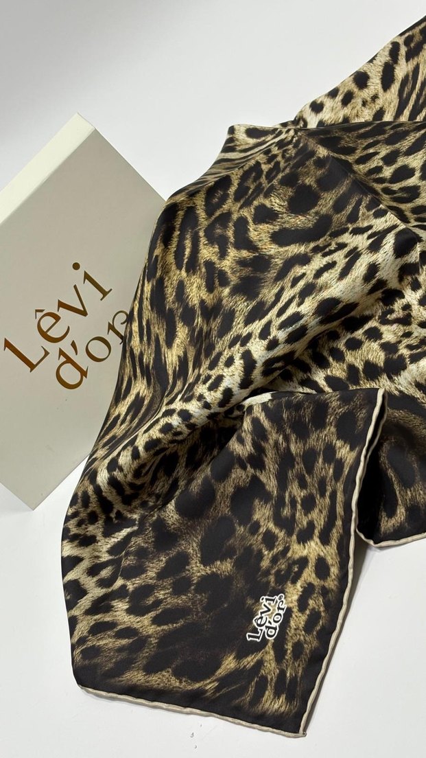 Kadınlar için parlak kahverengi leopar desenli, kürk detaylı ve ipeksi dokulu fular, klasik ve şık bir sokak stili sunar.