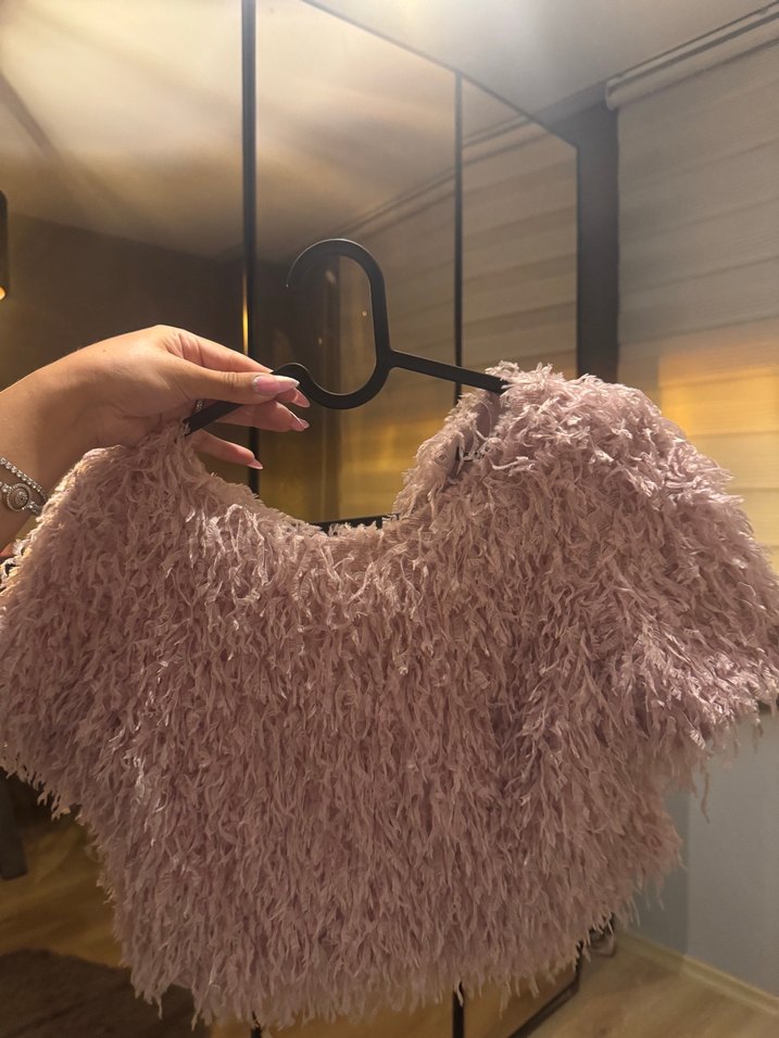 Kürk detaylı, uzun kollu, yuvarlak yaka, pembe kısa kadın kazak. Yumuşak örme kumaştan, bohem tarzda, şık ve rahat bir seçim.