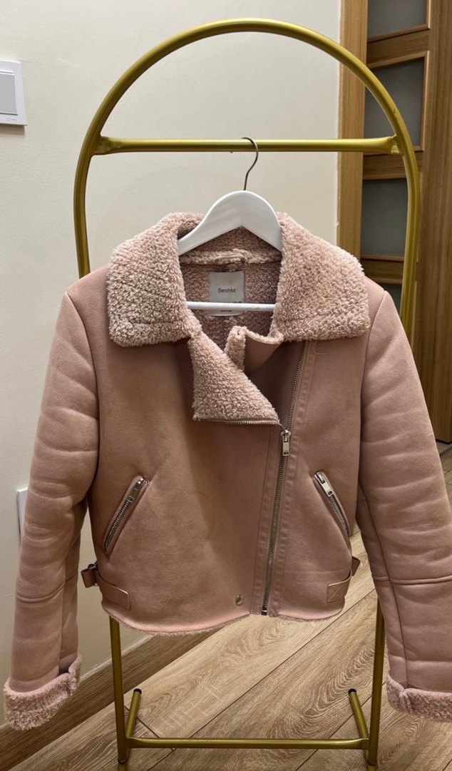 Kürk detaylı, pembe süetten yapılmış, kısa kesim ve baskılı dokulu, dar kesim ceket. Notlu yaka ve askılı kollara sahip, rahat sokak stili için uygun.