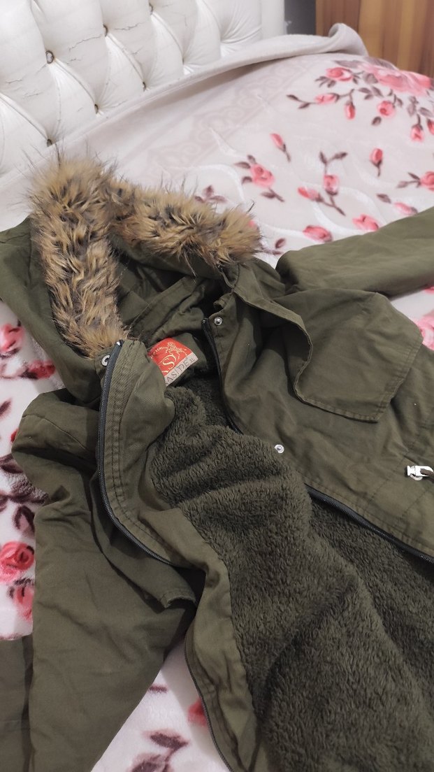 Kürk detaylı kapüşonlu, uzun kollu, normal midi boyda, sıcak ve yumuşak dokulu kadın kışlık mont. haki yeşiltonlarda, rahat sokak stili için uygun.