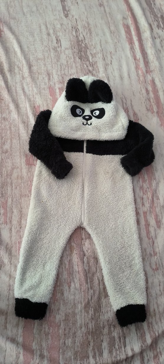 Bu bebek tulumu yumuşak ve sıcak kumaştan, kürk detaylıdır. Kapüşonunda panda baskısı ve fermuarı vardır, sokak stiline uygundur.