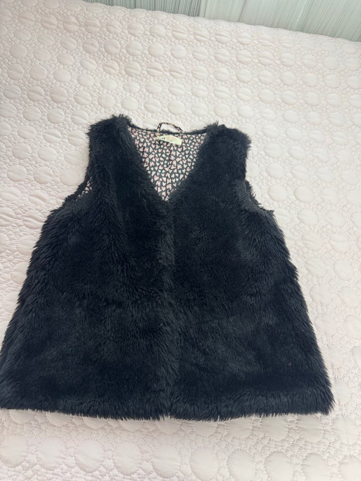 Yumuşak sentetik kumaştan, kürk detaylı, V yaka ve kolsuz siyah yelek. Fitted, midi boyda, günlük kullanıma uygun.