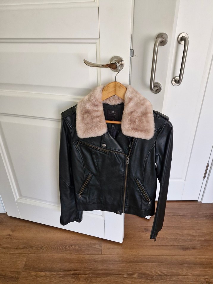 Fermuarlı cepleri ve yumuşak kürk yakası olan, günlük kullanım için uygun, fitted kesim siyah deri biker ceket.