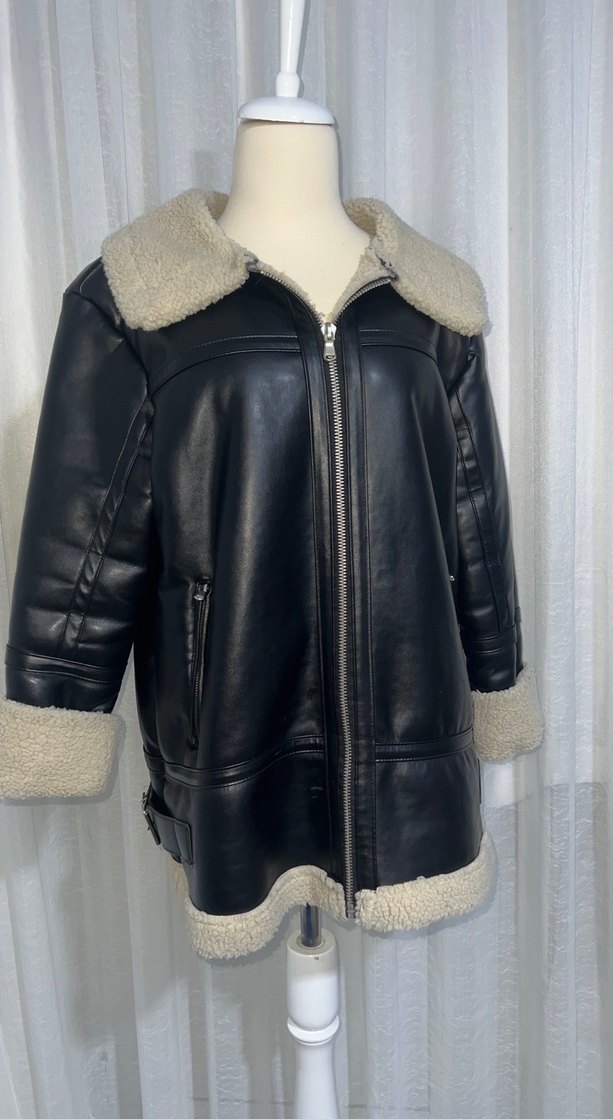 Kürk detaylı yakası, manşetleri ve etek ucu bulunan, siyah deri ve kemerli, normal boyda, strappy kollu biker tarzı fitted ceket.