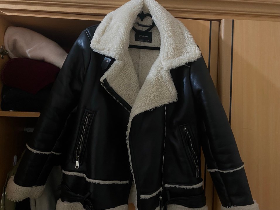 Fitted kesim siyah deri biker ceket, kürk detaylı ve yakası notched lapel. Günlük kullanıma uygun, rahat ve şık bir model.