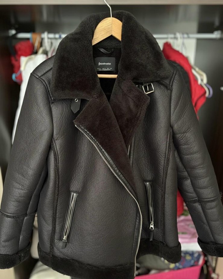 Stradivirius Kürk detaylı, siyah deri biker ceket. Normal uzunlukta, kesik yaka ve fermuarlı ceplerle şık ve rahat bir görünüm sunar. sorunsuz temiz üründür