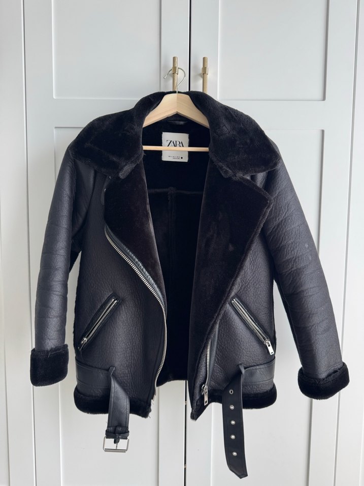 Siyah deri biker ceket, kürk detaylı, notalı yakalı ve regular fit. Midi boy, fermuarlı cepler ve askılı kollara sahip şık tasarım.