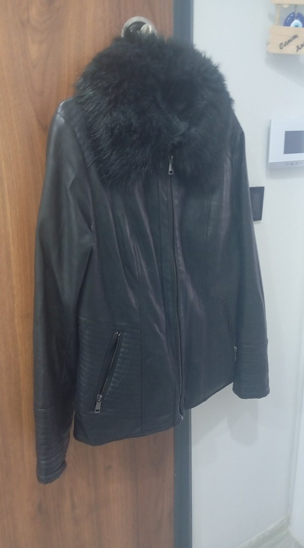 Kürk detaylı yakası ve uzun kollu, fitted kesim siyah deri biker ceket. Fermuarlı ön ve cep detaylarıyla midi boyda, sokak stili için uygun.