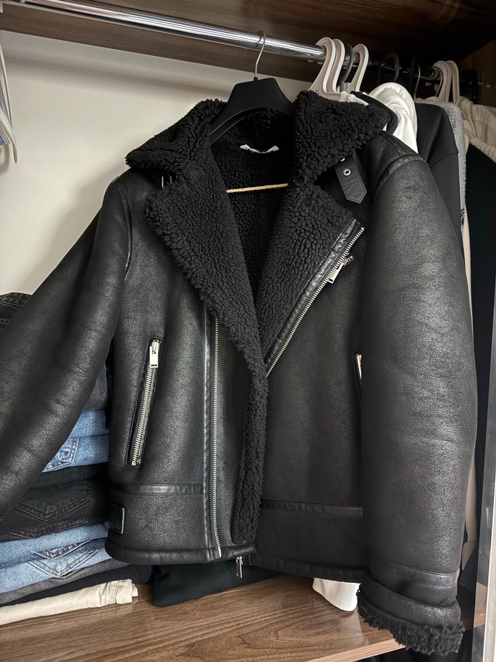 Kürk detaylı, siyah deri biker ceket, yakasında kesik yakalı ve normal midi uzunluktadır. Strappy kollu, şık ve günlük kullanıma uygundur. Zara erkek model ceket 2 3 defa giyildi m beden geniş kalıp