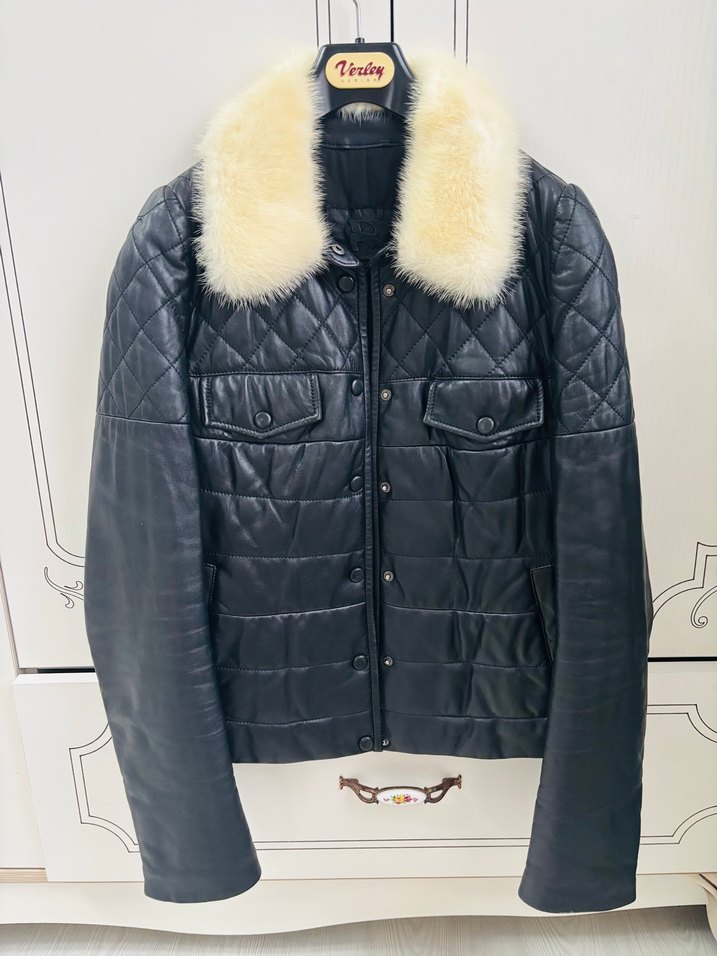 Kürk detaylı beyaz yakalı, siyah deri ceket.