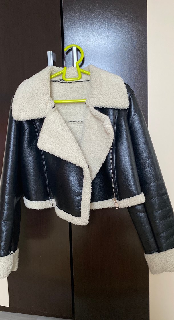 Siyah, kısa kesim, fitted deri ceket. Uzun kollu, kürk detaylı yakası, manşetleri ve eteği ile günlük rahat stil için uygundur.