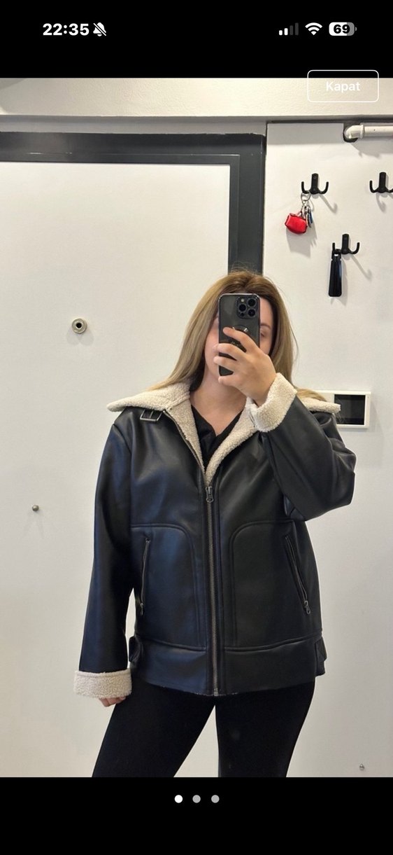 Gevşek kesim, yakası ve manşetleri kürklü siyah deri ceket, yüksek yakalı ve uzun kollu, günlük kullanım için uygun.
