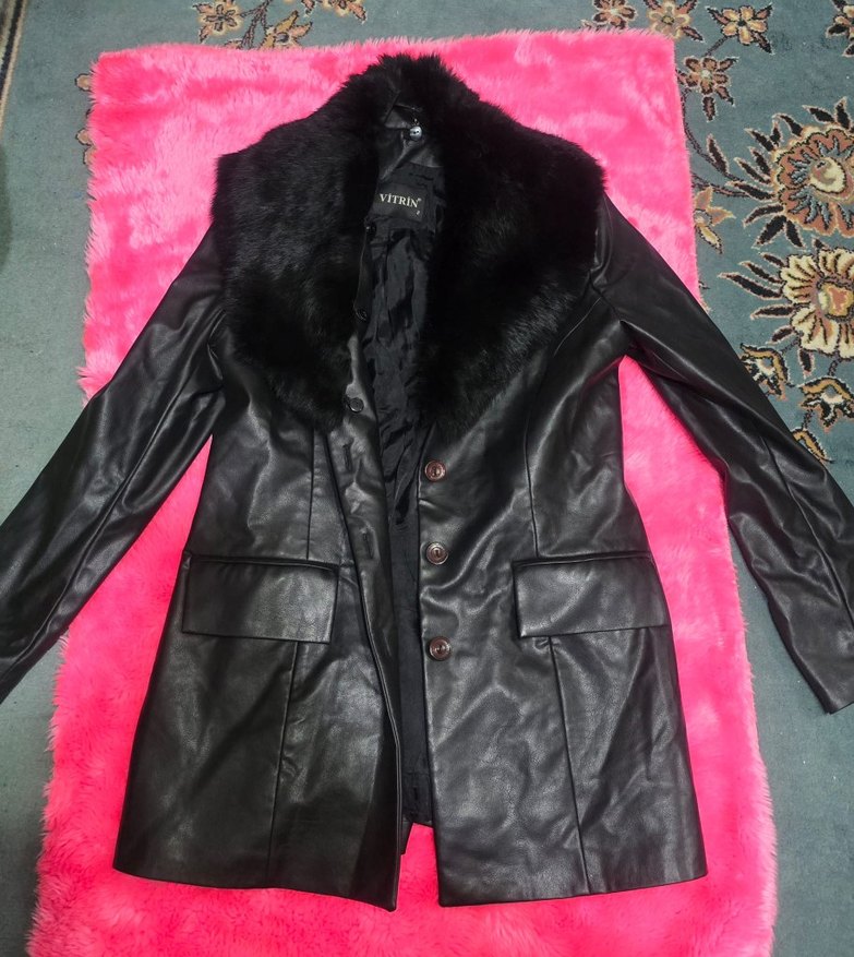 Kürk detaylı siyah deri ceket, uzun kollu ve normal boyda. Fitted kesimi ve çıtmalı yakası ile ofis kullanımına uygun.