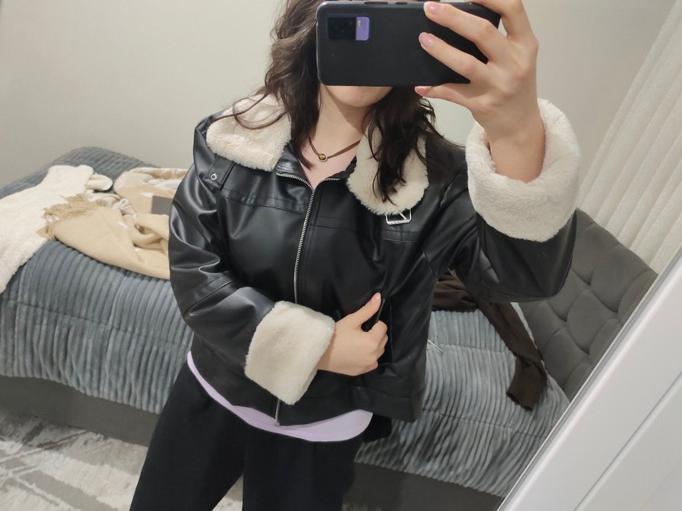 Bu siyah deri ceket, kürk detaylı yakası ve manşetleri ile dikkat çeker. Vücuda oturan kesimi, uzun kolları ve midi boyu ile günlük kullanıma uygundur. S-M beden uyumlu