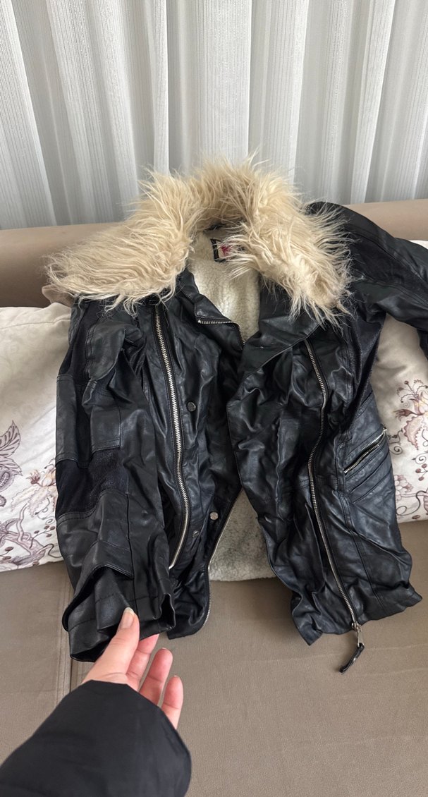 Kürk yakalı, strappy detaylı siyah deri mont. Fitted kesim ve normal boyda, gotik ve grunge punk tarzını yansıtır. Günlük kullanıma uygundur.