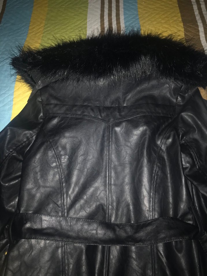 Kürk detaylı siyah deri, yakalı, strappy kollu, midi uzunlukta, fitted kesim kadın ceket. Gotik sokak stili için uygun.