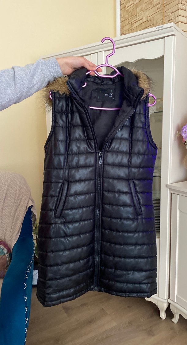 Kürk detaylı, yüksek yakalı, siyah deri ve kolsuz, rahat ve şık bir sokak stili yelek. Dış mekan kullanımı için uygun.
