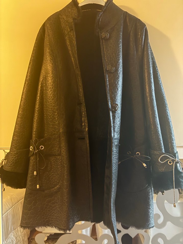 Siyah deri palto, kürk detaylı manşetler ve cepler, kırlangıç yaka ve bol kesim askılı kollara sahiptir. Midi boyda, desensiz, gotik tarzda ve ofis kullanımı için uygundur.