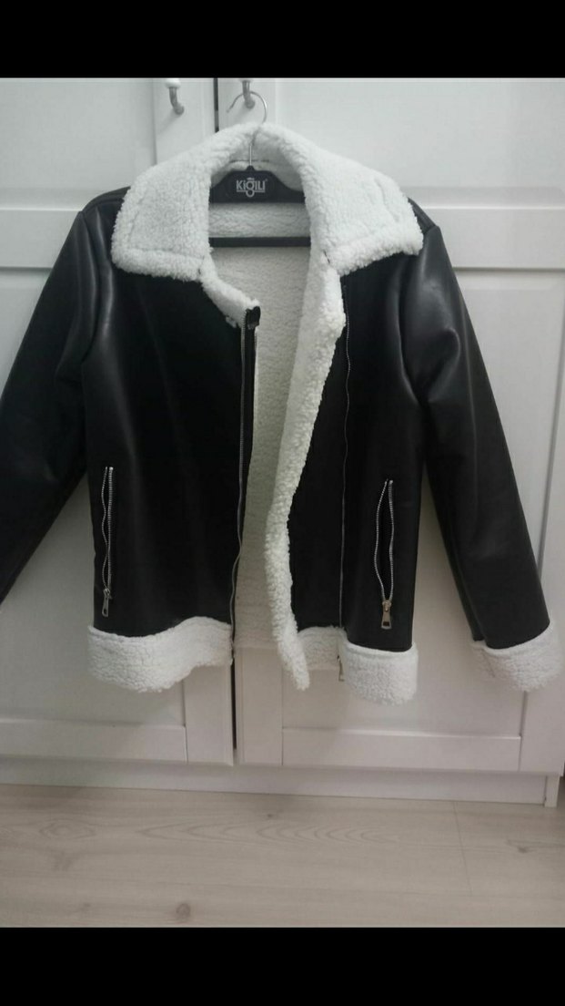 Kürk detaylı, siyah deri mini biker ceket. Kısa boy, notched lapel yaka ve askılı kollarla rahat ve şık bir görünüme sahip.