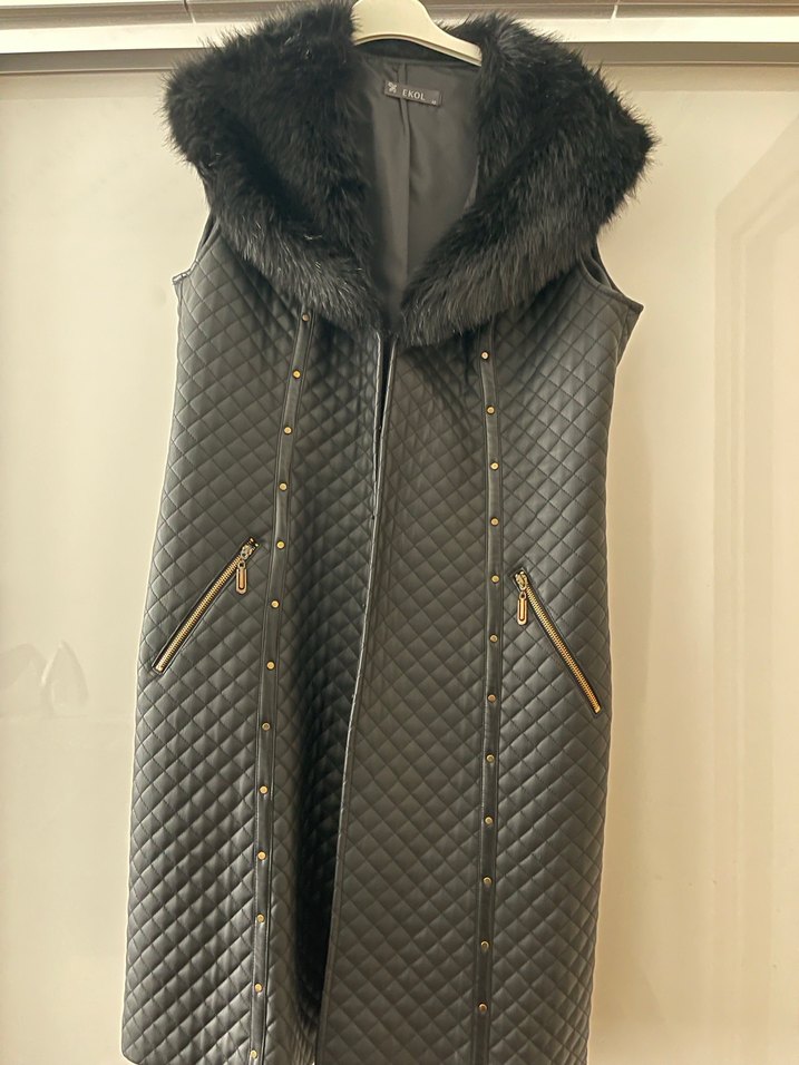 Kürk Detaylı Siyah Deri Uzun Yelek