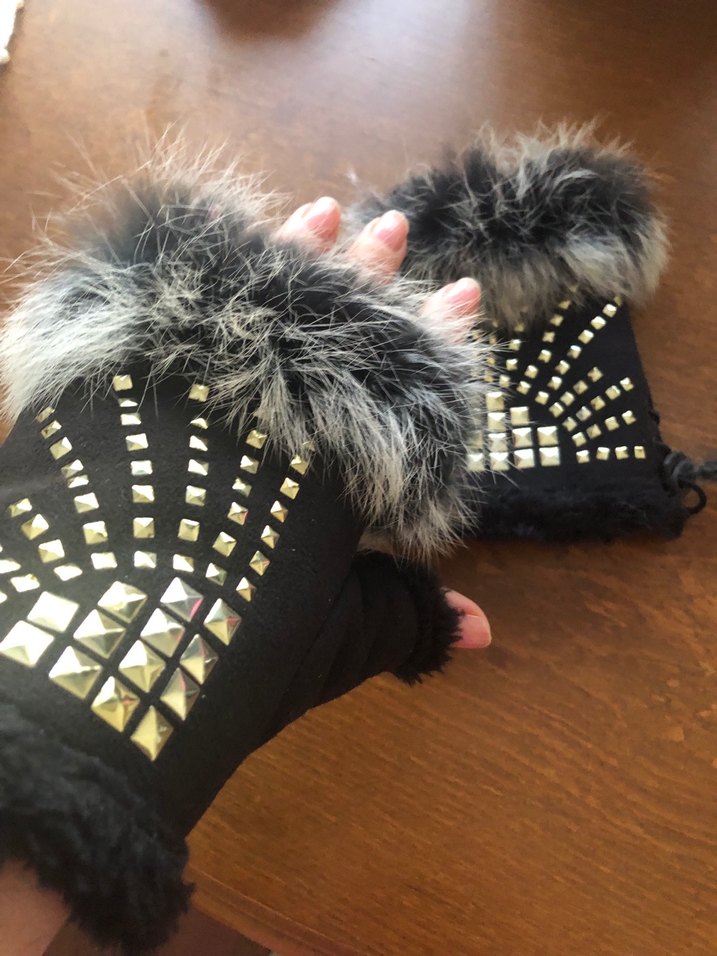 Yumuşak ve sıcak kumaştan yapılmış, kürk detaylı siyah gotik stil eldivenler, metal çivilerle süslenmiş.
