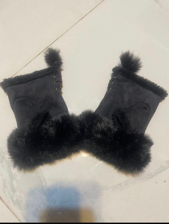 Kürk detaylı siyah kadın eldiveni, yumuşak ve sıcak kumaştan. Bağcıklı gotik tarzıyla şıklığı ve rahatlığı bir arada sunar.