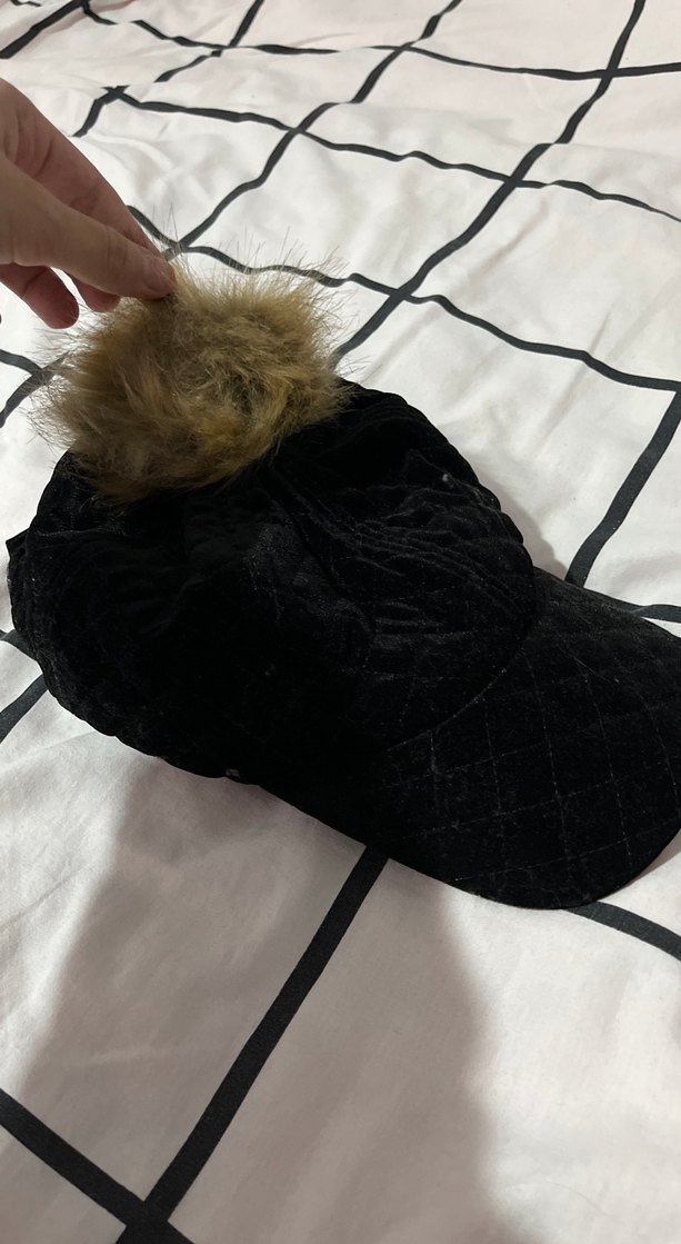 Yumuşak sentetik kumaştan yapılmış siyah gotik tarzda kadın şapka, üzerinde kürk detayı ile sıcak ve şık bir görünüm sunar.