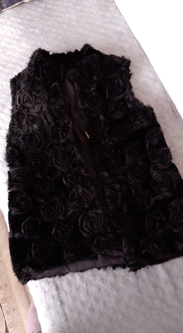Fitted kesim, kürk detaylı siyah kadın yelek. Notch yaka ve desenli dokusu ile gotik tarzda, midi boy ve kolsuz tasarım. el yapımı özel tasarim