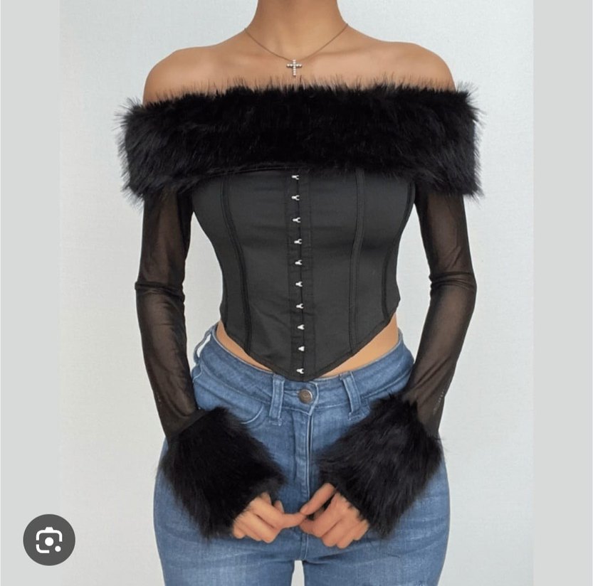 Siyah, straplez ve kürk detaylı bu dar kesim büstiyer, pürüzsüz sentetik kumaştan üretilmiştir. Gotik parti stiline uygundur.
