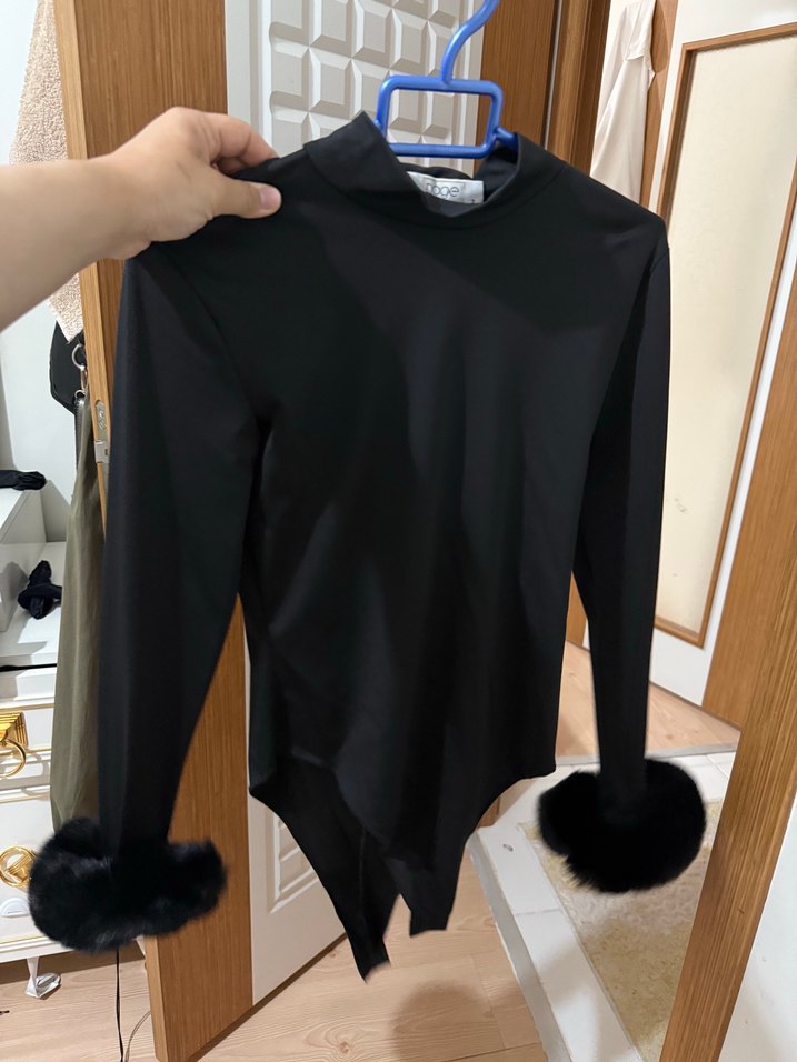 Kürk detaylı, uzun kollu siyah bluz. Yuvarlak yakalı, midi boyda ve vücuda oturan kesime sahip. Yumuşak sentetik kumaştan üretilmiştir.