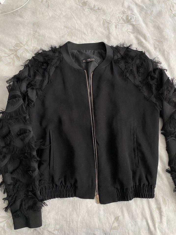 Uzun kollu, kürk detaylı siyah kadın ceket. Sentetik kumaştan, midi boy, bol kesim ve yuvarlak yaka ile günlük kullanıma uygun.