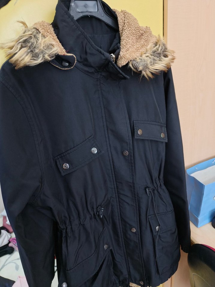 Siyah, kürk detaylı, kapüşonlu ve astarlı kadın kışlık ceket. Uzun kollu, normal boyda ve sokak modasına uygun, rahat ve şık bir parça.