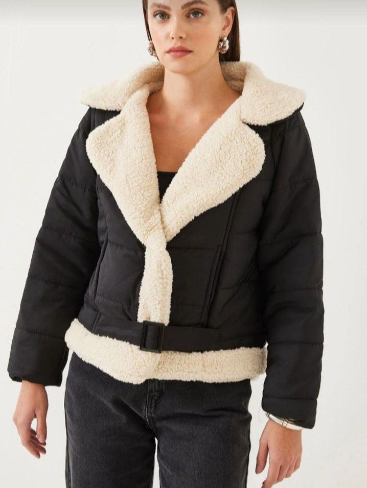 Fitted kesim, kürk detaylı siyah kışlık ceket. Notch yaka, orta boy uzunluk ve rahat fleece astar ile günlük kullanıma uygun.