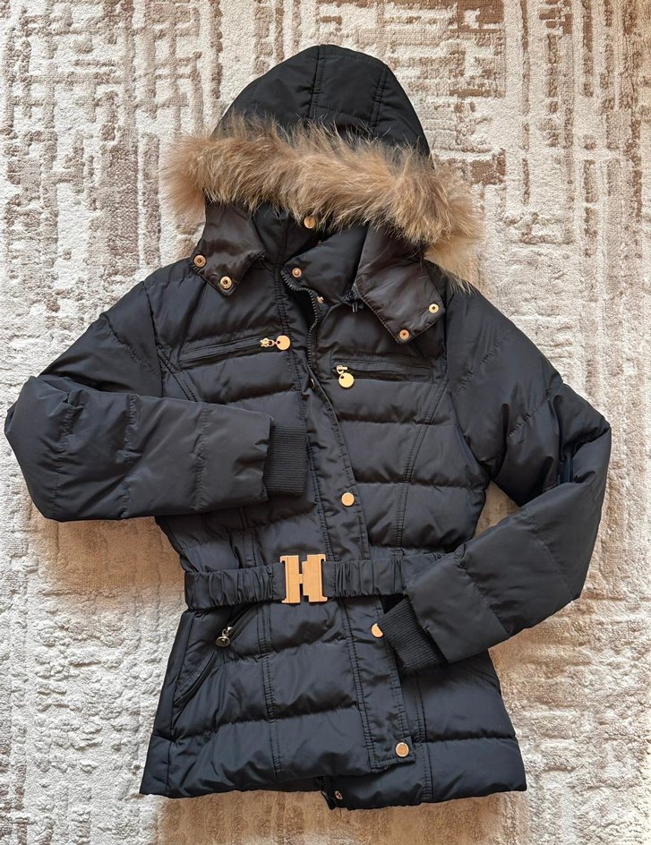 Siyah, kürklü kapüşonlu ve kruvaze yakalı, sentetik kumaştan yapılmış, beli kemerli, midi boy, günlük kullanıma uygun kadın kışlık mont. Hiç Kullanılmamıştır.