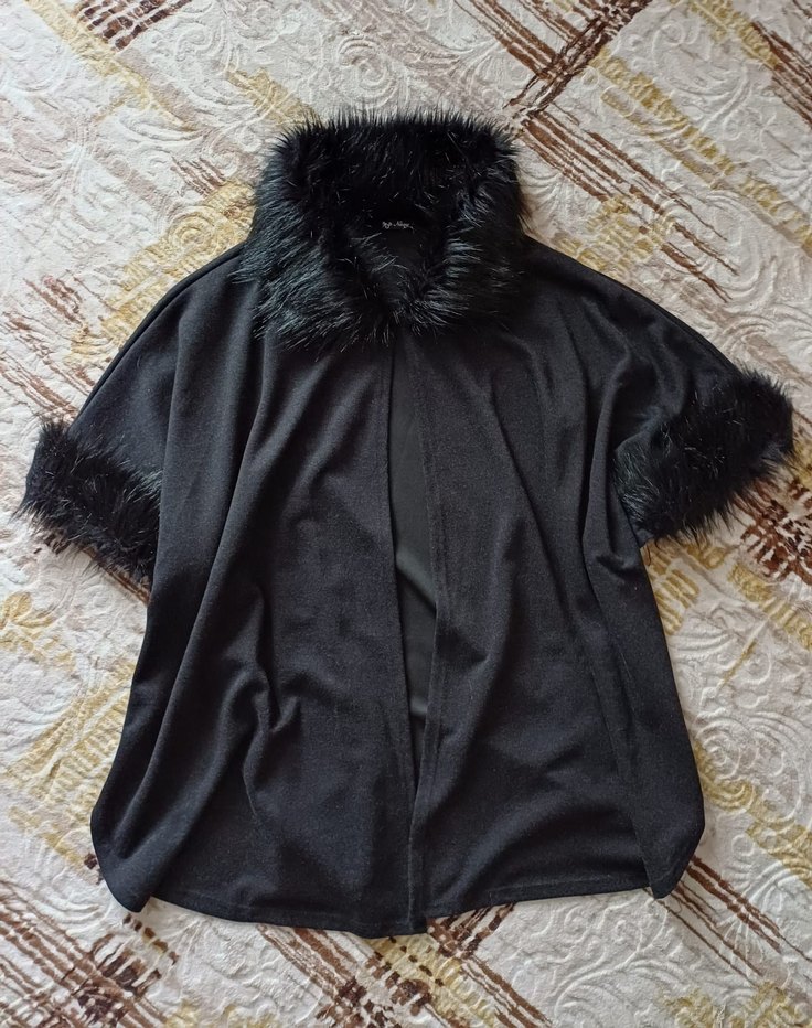 Kürk detaylı yakası ve kısa kollu, midi boyda, bol kesim siyah kadın panço. Rahat ve goth tarzında bir tasarım.