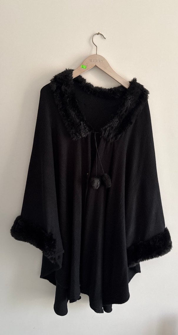 Yüksek yakalı, uzun kollu siyah kadın panço, yakada ve manşetlerde kürk detaylıdır. Rahat kesim, midi boy ve yumuşak, sıcak kumaştan üretilmiştir.