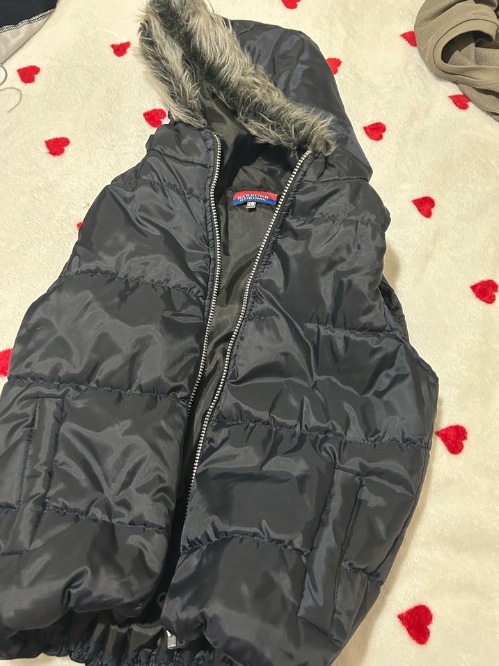 Kürk detaylı kapüşonlu, kolysuz siyah şişme yelek. Yumuşak fleece kumaştan, normal midi boyda ve dar kesimdir. Günlük rahat kullanım için uygundur.