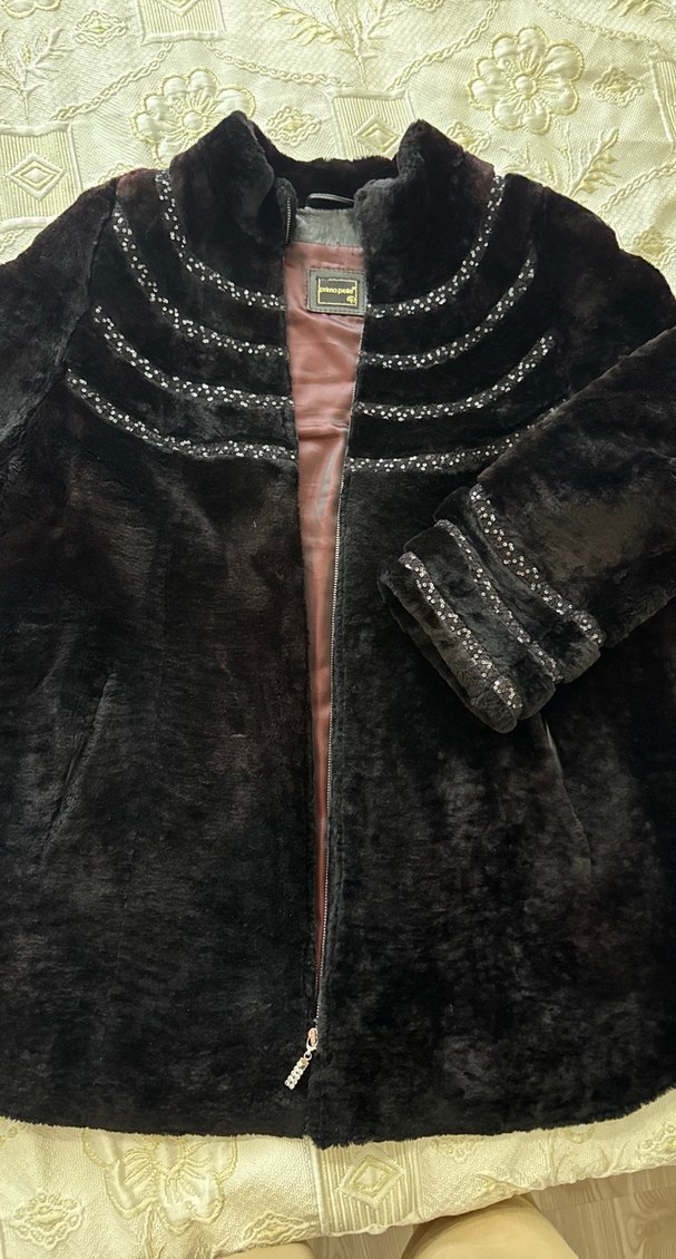 Kahverengi süet kadife kaban, kürk detaylı ve nakışlı desenlere sahip. Notch yakalı, uzun kollu, midi boyda ve rahat kesimdir. Markası dünyaca ünlü prima pelle