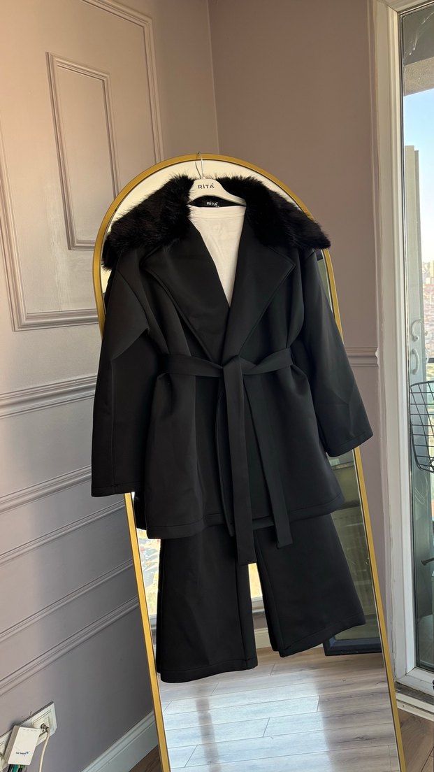 Kürk Detaylı Siyah Kadın takım