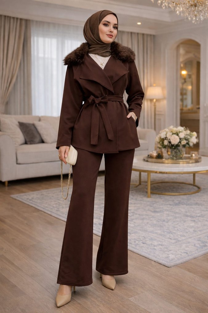 Siyah kadın takım, etnik desenli, kürk detaylı uzun ceket, normal kesim ve yakalıdır. Yumuşak ve sıcak kumaştan, günlük kullanıma uygundur.